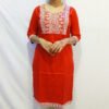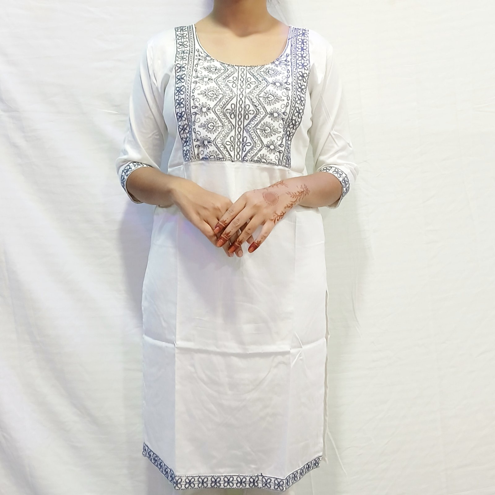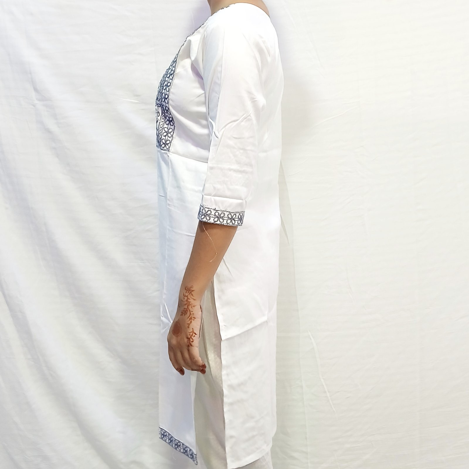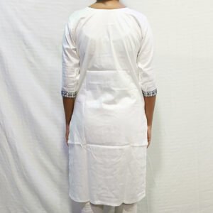 This elegant white cotton kurti features intricate grey embroidery on the yoke, adding a touch of sophistication to your wardrobe. Designed for comfort and style, this kurti is perfect for casual outings, office wear, and festive occasions.