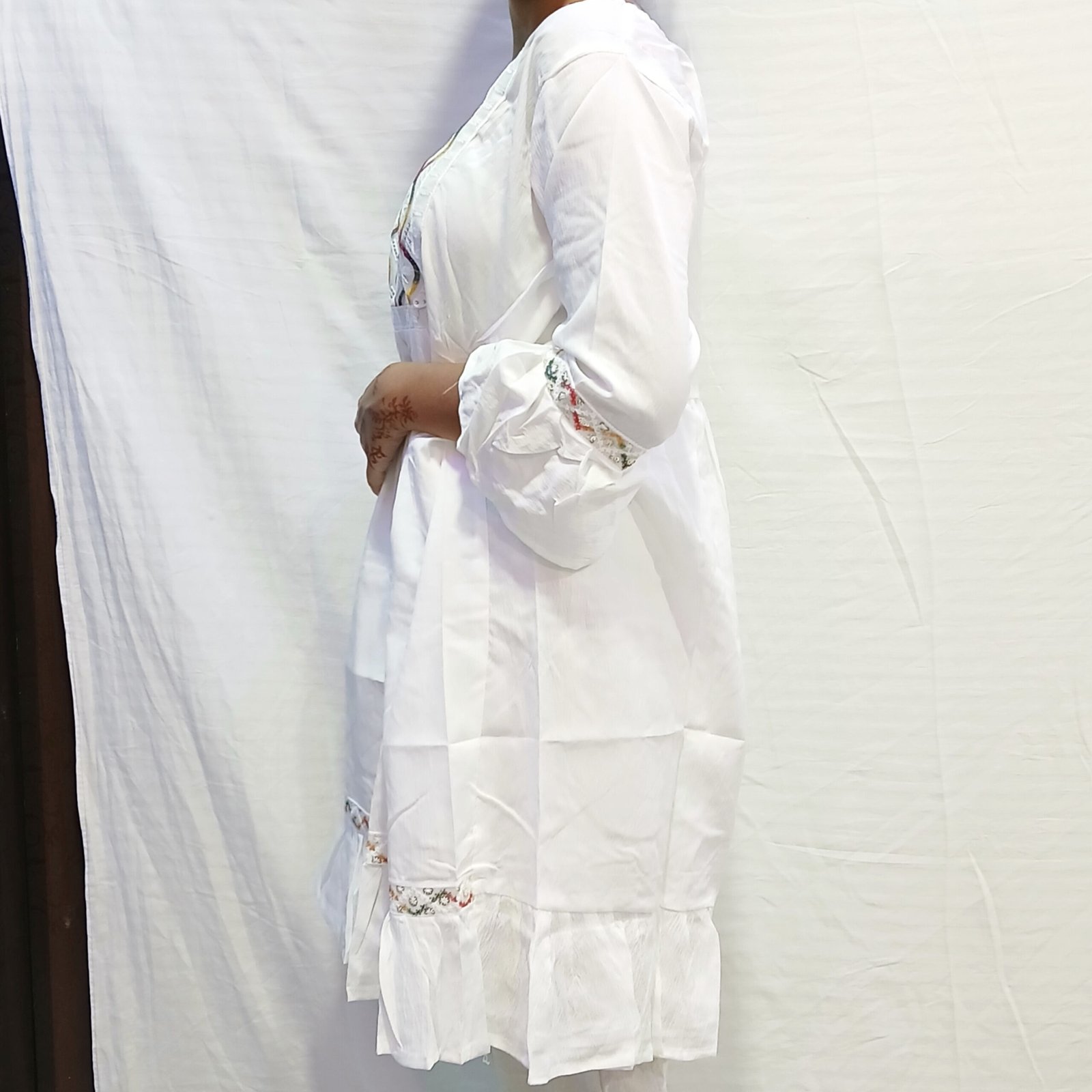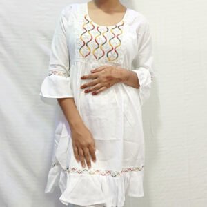 This beautifully designed white cotton kurti is a must-have for your ethnic and casual wardrobe. Featuring delicate multicolor embroidery on the neckline and sleeves, this kurti is perfect for adding elegance to your everyday style. The flared sleeves and pleated hemline give it a graceful look, making it ideal for casual outings, office wear, and festive occasions.